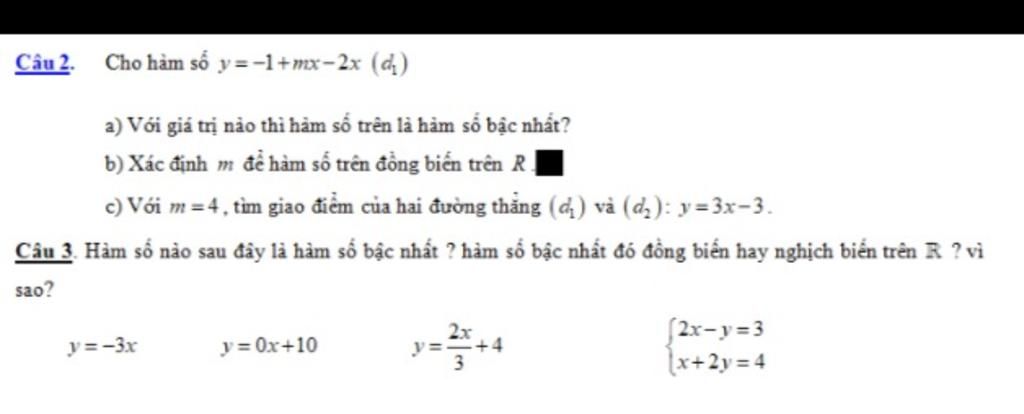 Câu 3 Hàm số nào sau đây là hàm số bậc nhất ? hàm số bậc nhất đó đồng biến hay nghịc ...
