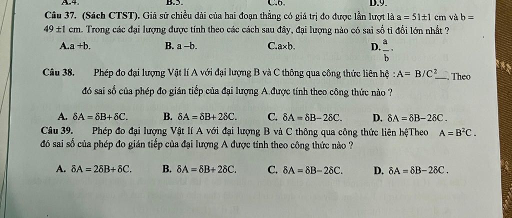 Câu 37. (Sách CTST). Giả sử chiều dài của hai đoạn thẳng có giá trị đo được lần lượt là a = 51±1 cm và b =