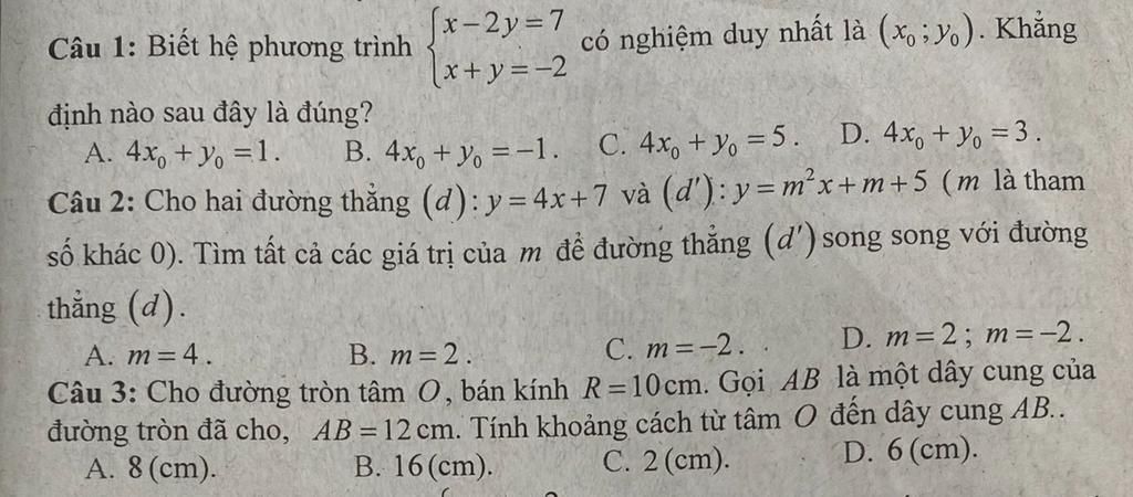 Câu 2: Cho hai đường thẳng (d): y=4x+7 và (d): y=m’x+m+5 (m là tham