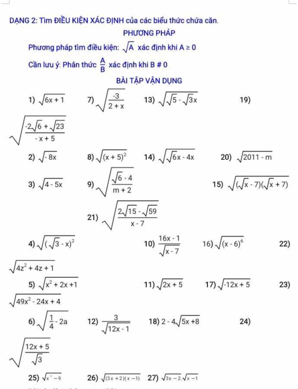 DẠNG 2: Tìm ĐIỀU KIỆN XÁC ĐỊNH của các biểu thức chứa căn.
