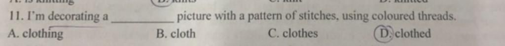 `+` Đáp án `A`, `C` và `D` đều liên quan đến quần áo. Sử dụng trong câu trên hoàn toàn không phù hợp nghĩa nên ta loại.