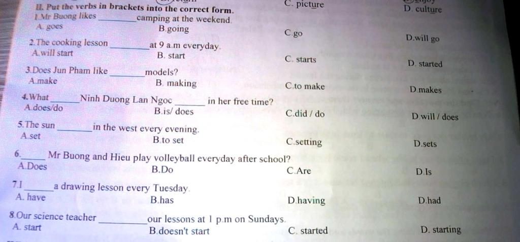 - Vì The cooking lesson là ngôi ba số ít nên động từ start `->` starts