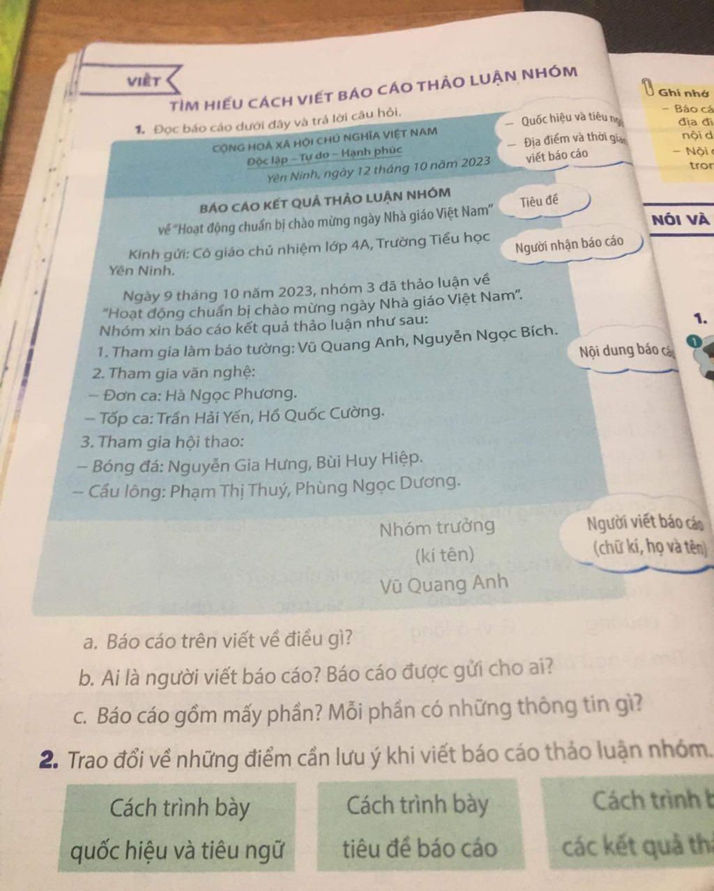 b. người viết báo cáo là nhóm trưởng VŨ QUANG ANH. gửi cho giáo viên chủ nhiệm lớp 4A