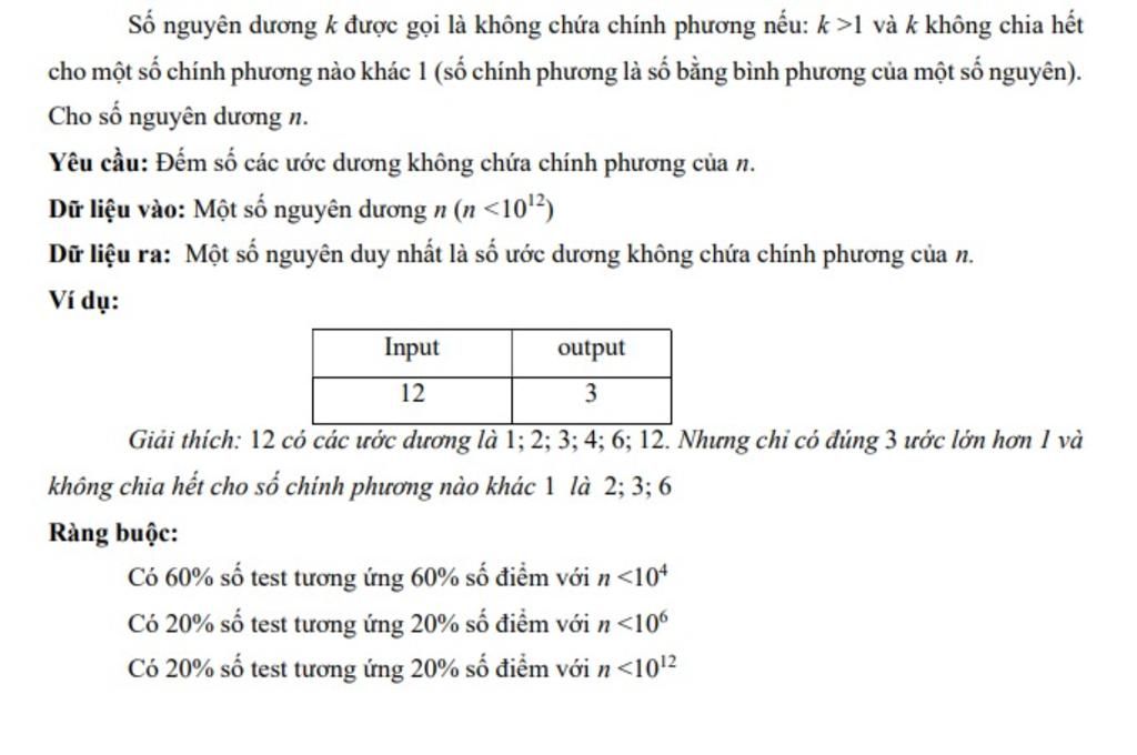 Thuật toán của mình là kiểm tra xem các ước của n, có số nào là số không chứa chính phương, bằng cách kiểm tra xem các ước của số đó có số nào là số chính phương hay không
