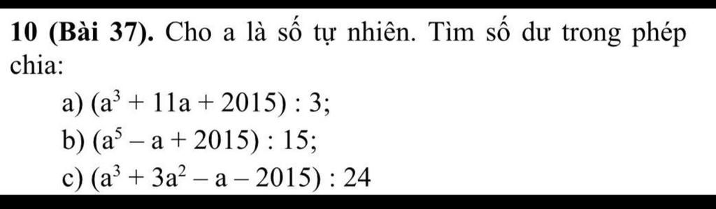 a) Để tìm số dư trong phép chia \( \left(a^{3}+11 a+2015\right) \) cho 3, chúng ta có thể thực hiện các bước sau: