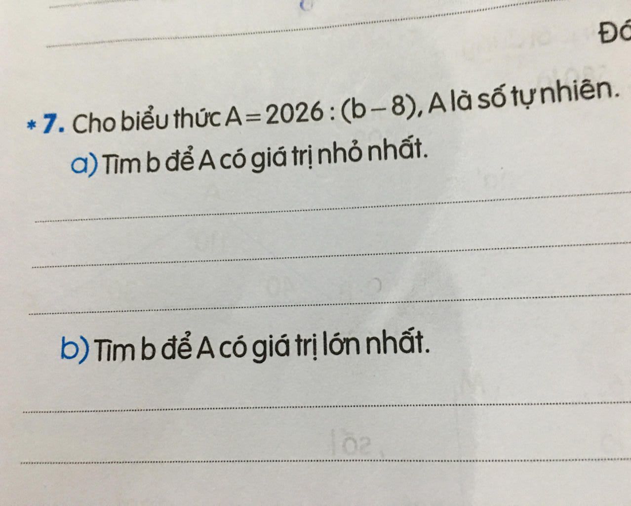 `b)` ta phải tìm chữ số `b` nhỏ nhất có thể để `A` có giá trị lớn nhất và `b<8`, `b` không thể là `8` vì nếu vậy `8-8=0` và `2026:0` sẽ không có kết quả, nên ta lấy `9` vì `9` lớn hơn `8` chỉ có `1` đơn vị, thay thế cho `b`