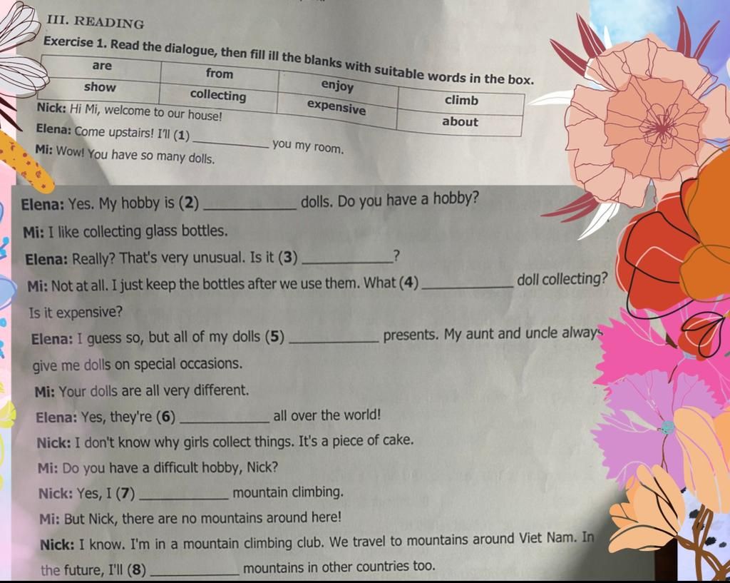 Exercise 1. Read the dialogue, then fill ill the blanks with suitable words in the box.