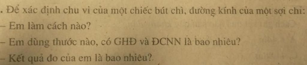 bn phải làm thế này nhé tui tự đưa ra này thì gim nè Xác định chu vi của bút chì: dùng sợi chỉ quấn sát nhau xung quanh bút chì 1 hoặc 10 vòng,… (đánh dấu độ dài tất cả các vòng dây này trên sợi chỉ). Dùng thước có ĐCNN phù hợp (1mm) để đo độ dài đã đánh dấu. Lấy kết quả đó chia cho số vòng dây, cậu được chu vi của bút chì. - Xác định đường kính sợi chỉ; tương tự quấn 10 hoặc 20 vòng sát nhau xung quanh bút chì (đánh dấu độ dài đã quấn được trên sợi chỉ). Dùng thước có ĐCNN phù hợp (1mm) để đo độ dài đã đánh dấu. Lấy kết quả chia cho số vòng dây, cậu được đường kính sợi chỉ