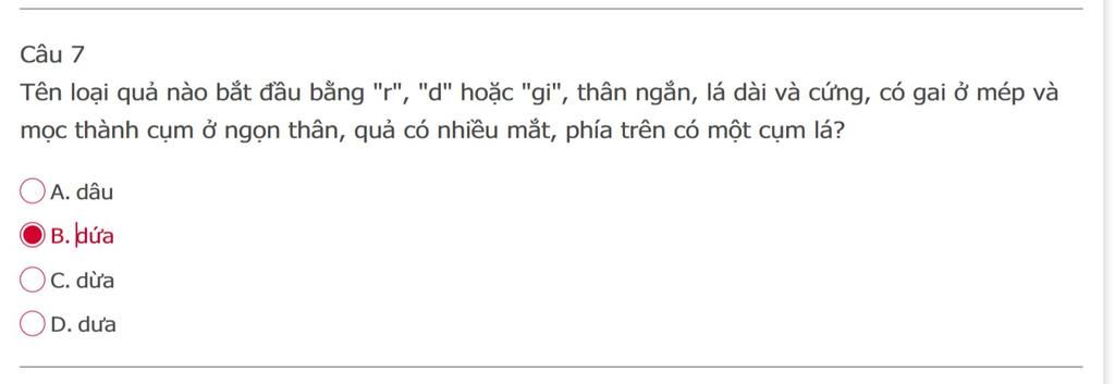 $\approx$ Vì tên loại quả ở các ý đều có "d" nên ta bỏ qua.