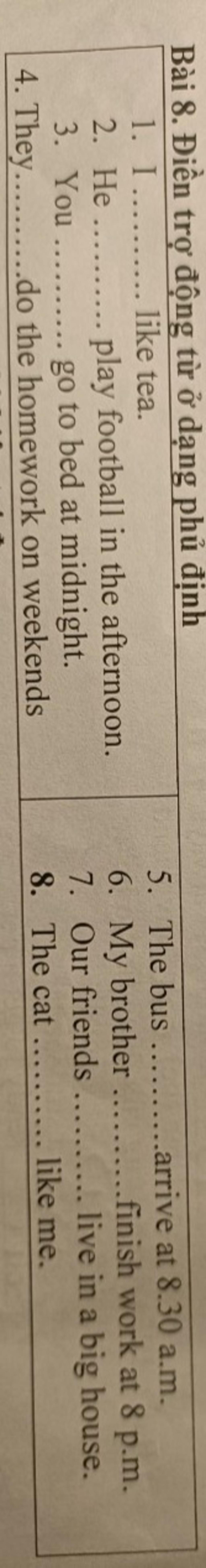 Phủ định của do là do not hay don't , còn của does là doesn't hoặc là does not