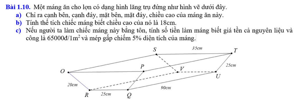 Bài 1.10. Một máng ăn cho lợn có dạng hình lăng trụ đứng như hình vẽ dưới đây.