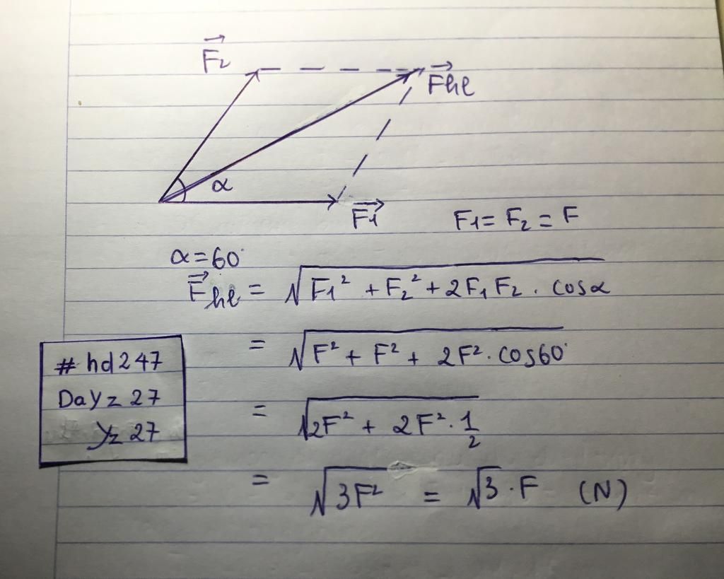 \(F = 2{F_1}\cos \dfrac{\alpha }{2} = 2.{F_1}\cos 30 = {F_1}\sqrt 3 \)