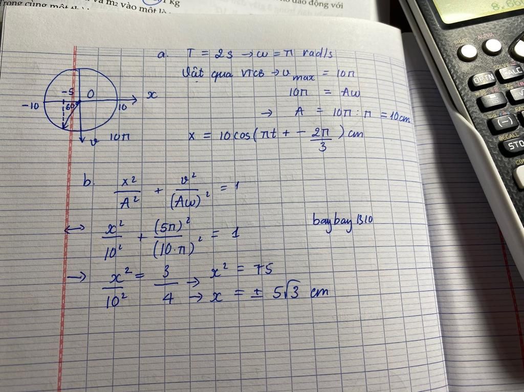 Vậy li độ của vật tại thời điểm vật có vận tốc `5pi` cm/s là `x = +-5\sqrt3 (cm)`