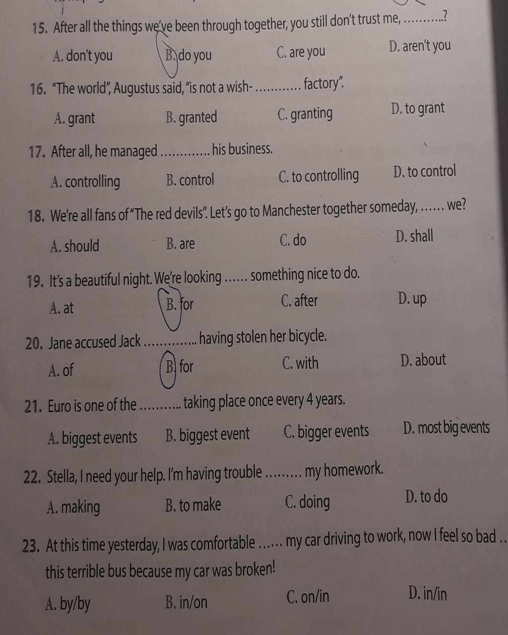 22.D do trouble đi chung với V1 và chỉ do mới đi được với homework thôi nha