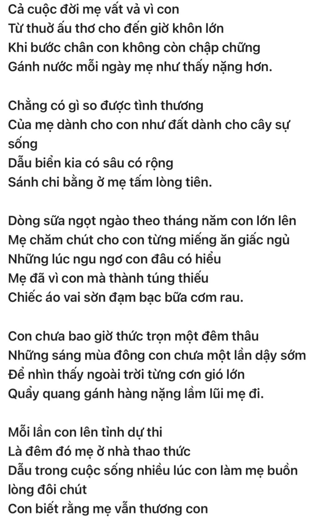 Quá trình trưởng thành của con luôn gắn liền với hình ảnh của người mẹ, ấy là khi còn bé, mẹ nuôi con bằng dòng sữa ngọt ngào, chăm chút cho con từng miếng ăn giấc ngủ, cho con những điều tốt đẹp nhất trên đời. Người mẹ ấy luôn đón nhận và chịu đựng vất vả để đứa con mình được lớn lên mà không phải thiếu thốn bất kì điều gì. Những vất vả ấy kể sao cho siết, là sự lãnh lẽo của những đêm đông giá rét vẫn phải gánh hàng đi bán, là bao đêm thao thức vì con. Tình cảm ấy có lẽ là thứ tình cảm thiêng liêng nhất, trân quý nhất, ấm áp nhất đối với những đứa con.