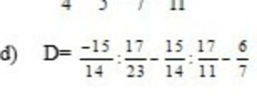 `d) D= -15/14 : 17/23 - 15/14 : 17/11 - 6/7`
