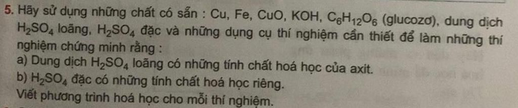 a/ Các thí nghiệm chứng minh dung dịch `H_2SO_4` loãng có những tính chất hoá học chung của axit: `H_2SO_4+ Fe-> FeSO_4+ H_2`↑ `H_2SO_4+ CuO-> CuSO_4+ H_2O` `H_2SO_4+ 2KOH-> K_2SO_4+ H_2O` b/ `H_2SO_4` có tính chất hoá học riêng: - Tác dụng với kim loại không có khí `H_2` thoát ra mà thay vào đó là các sản phẩm khử như `SO_2,H_2S,NO,NO_2...` `VD: 2Fe+ 6H_2SO_4đặc//nóng-> Fe_2(SO_4)_3+ 3SO_2↑+ 6H_2O` - Tác dụng được với nhiều kim loại: `VD: Cu+ 2H_2SO_4đặc,nóng-> CuSO_4+ SO_2↑+ 2H_2O` - Axit `H_2SO_4` có tính háo nước mạnh. Rút gọna/ Các thí nghiệm chứng minh dung dịch `H_2SO_4` loãng có những tính chất hoá học chung của axit: `H_2SO_4+ Fe-> FeSO_4+ H_2`↑ `H_2SO_4+ CuO-> CuSO_4+ H_2O` `H_2SO_4+ 2KOH-> K_2SO_4+ H_2O` b/ `H_2SO_4` có tính chất hoá học riêng: - Tác dụng với kim loạ... xem thêm