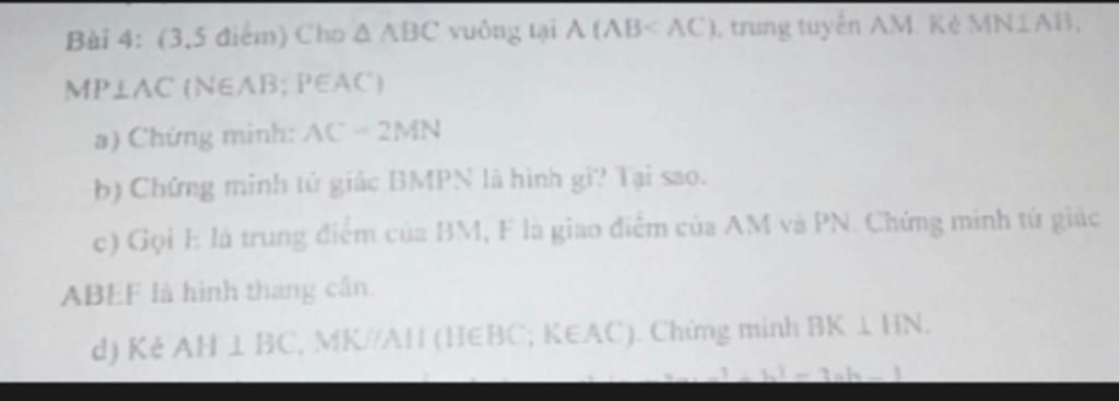 a) MN vuông góc với AB, AB vuông góc với AC => MN // AC