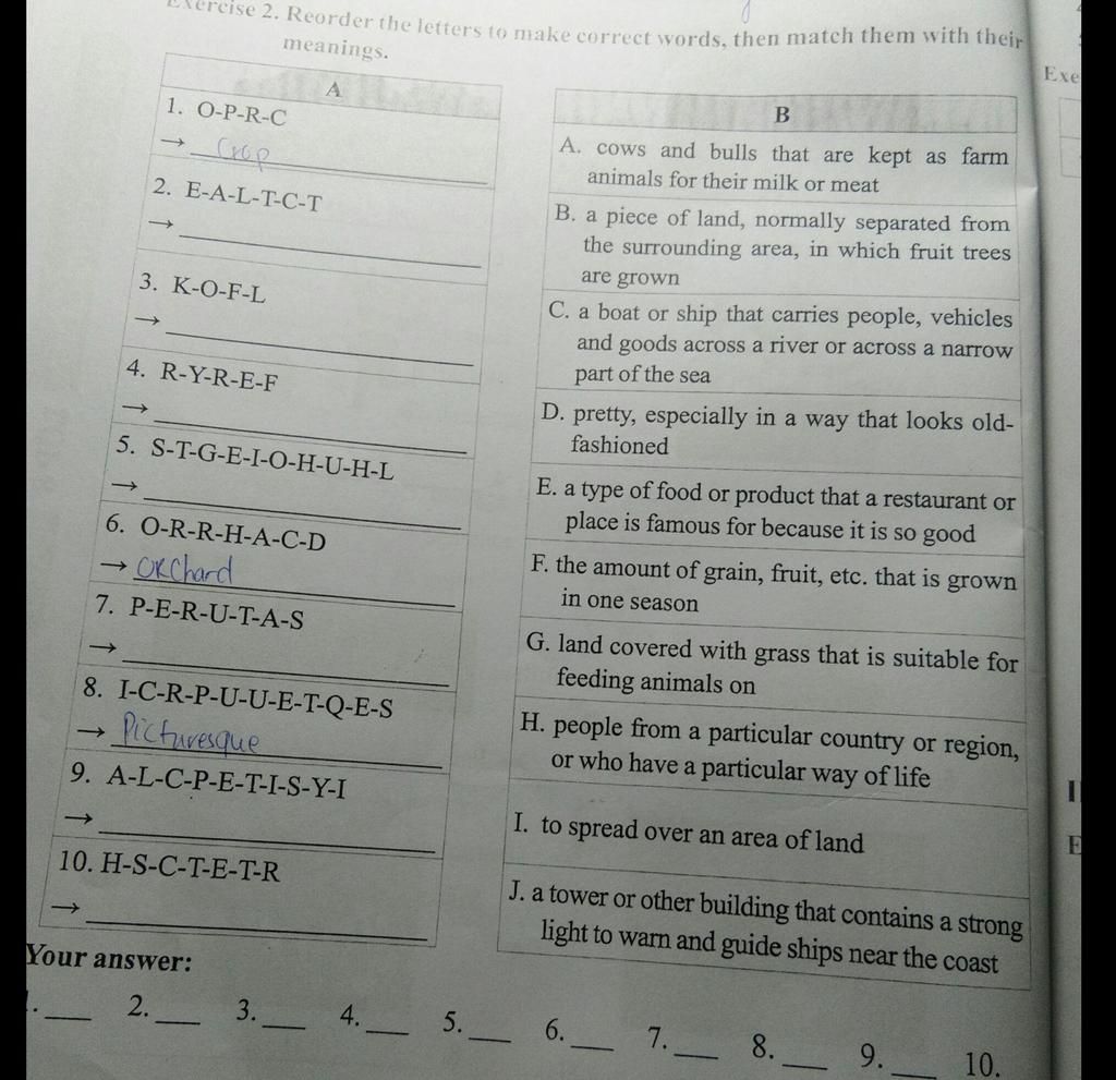 cise 2. Reorder the letters to make correct words, then match them with their