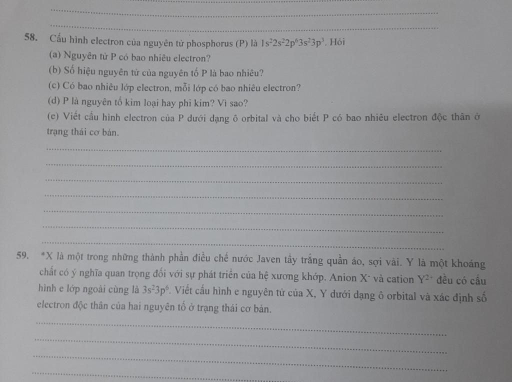 58. Cấu hình electron của nguyên tử phosphorus (P) là 1s22s22p3s3p. Hỏi