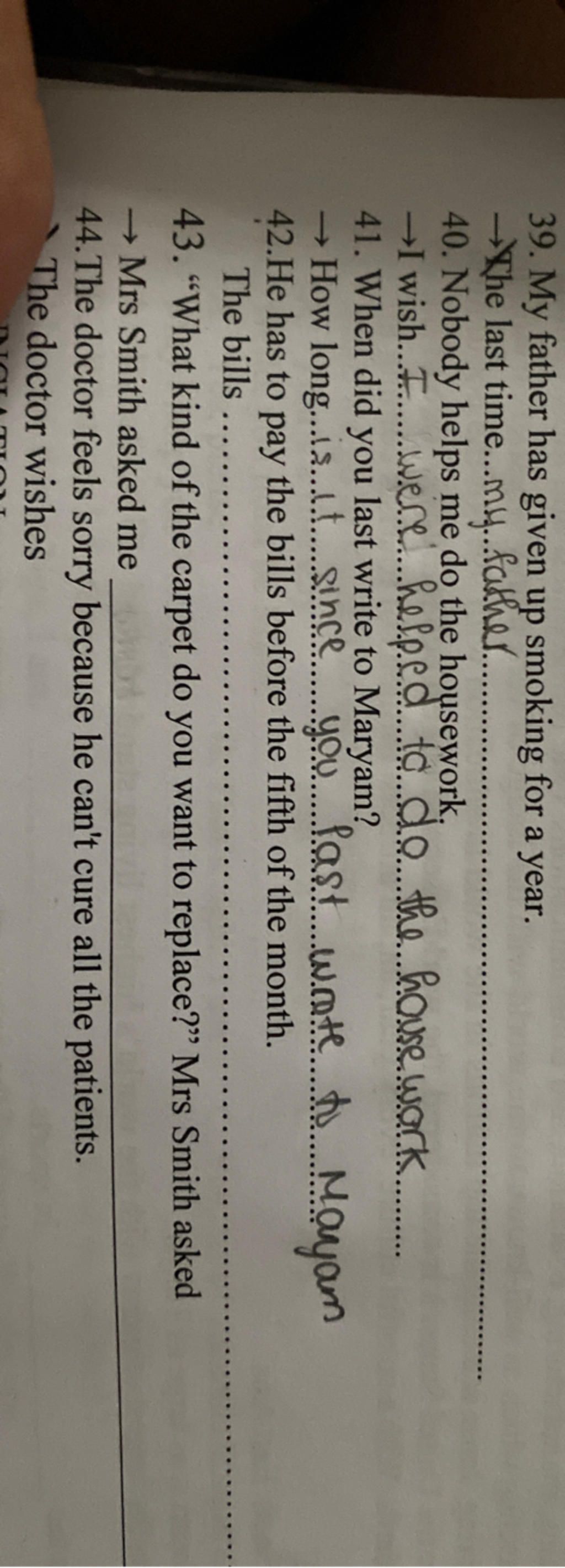 `43.` Mrs. Smith asked me what kind of the carpet I wanted to replace.