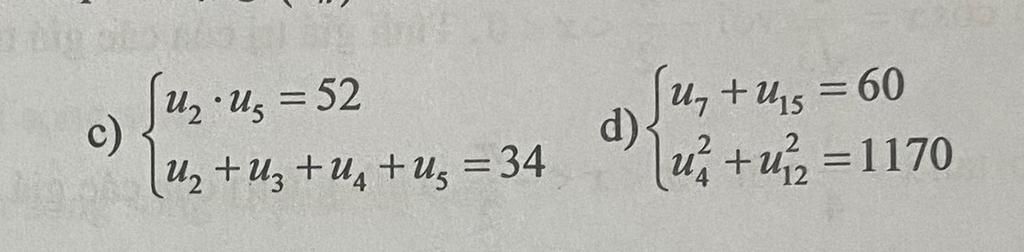 d) $\left \{ {{u_7+u_{15}=60} \atop {u_4^{2}+u_{12}^{2}=1170}} \right.$