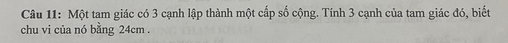 Để tìm 3 cạnh của tam giác có chu vi bằng 24cm và 3 cạnh lập thành một cấp số cộng, ta chia chu vi cho 3 để tìm ra số hạng giữa, sau đó trừ và cộng 1 để tìm ra 2 số hạng còn lại.