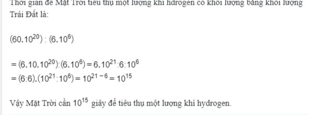 Trái đất có khối lượng khoảng 60 x 10^2 Tấn mỗi dây mặt trời tiêu thụ 6 nhân 10 mũ 6 tấn khí hydrogen (theo vnexpress. net) hỏi mặt trời cần bao nhiêu giây để tiêu thụ một lượng khí hydrogen có khối lượng bằng khối lượng trái đất