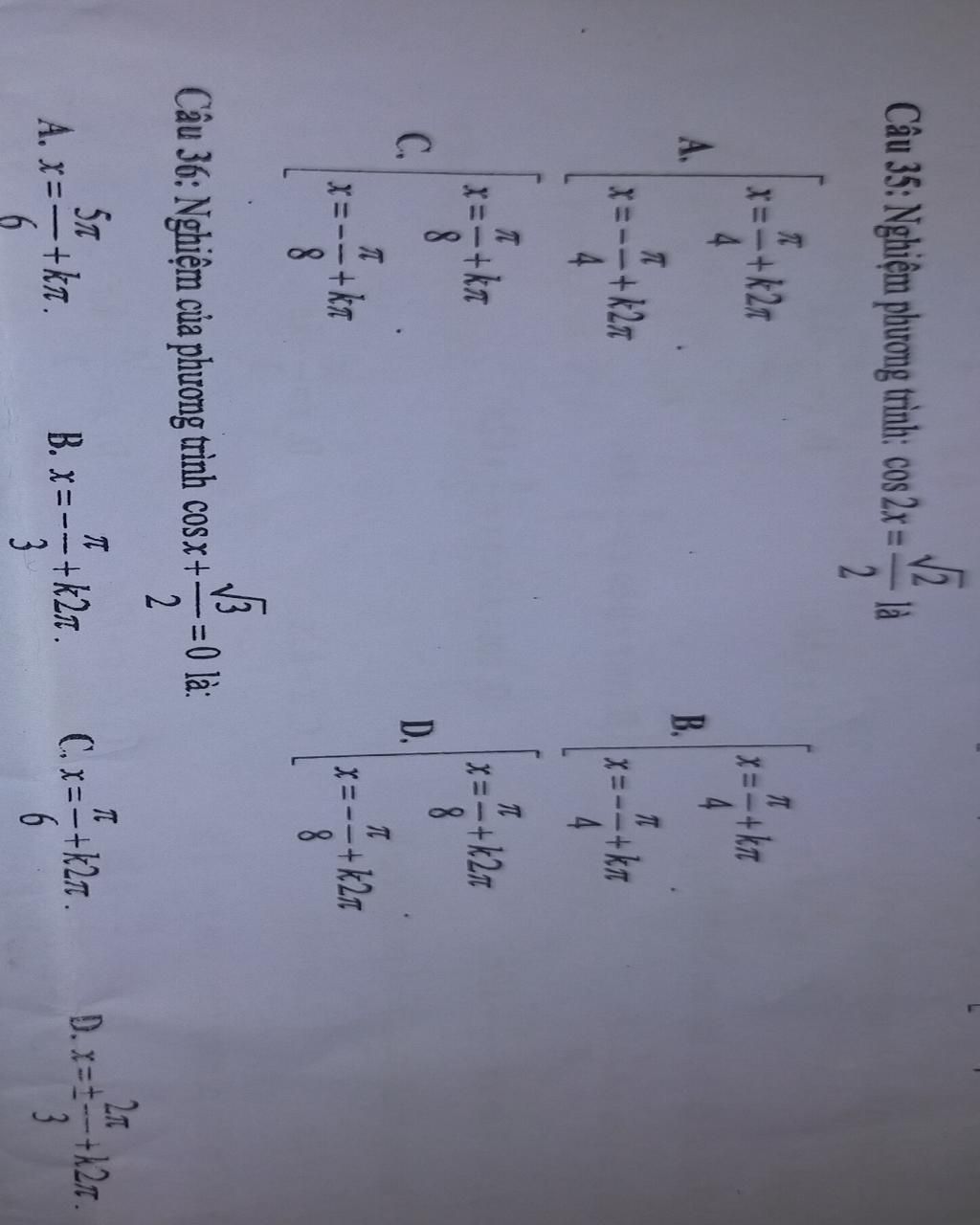 Câu 35: cos 2x = $\frac{\sqrt{2}}{2}$ $\Leftrightarrow$ cos 2x=cos $\frac{\pi}{4}$ $\Leftrightarrow$ $\left[\begin{matrix}2x=\frac{\pi}{4}+k2\pi \\ 2x=-\frac{\pi}{4}+k2\pi\end{matrix}\right.$ $\Leftrightarrow$ $\left[\begin{matrix} x=\frac{\pi}{8}+k2\pi\\ x=-\frac{\pi}{8}+k2\pi\end{matrix}\right.$
