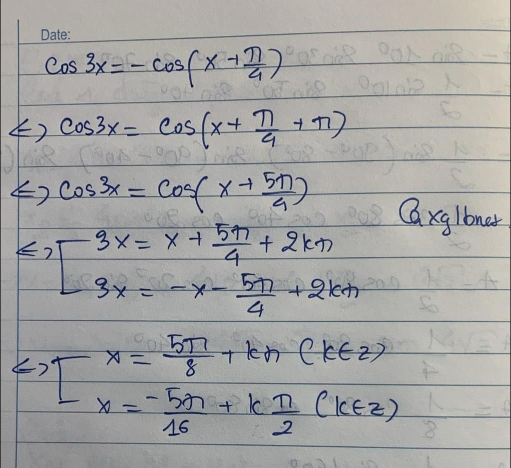 `<=>` `cos3x=cos(x+(5pi)/4)`