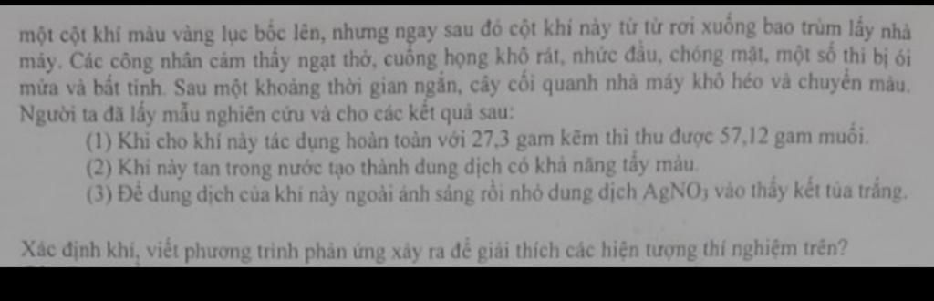 Khí màu vàng lục và gây ra các hiện tượng nói trên là Cl2