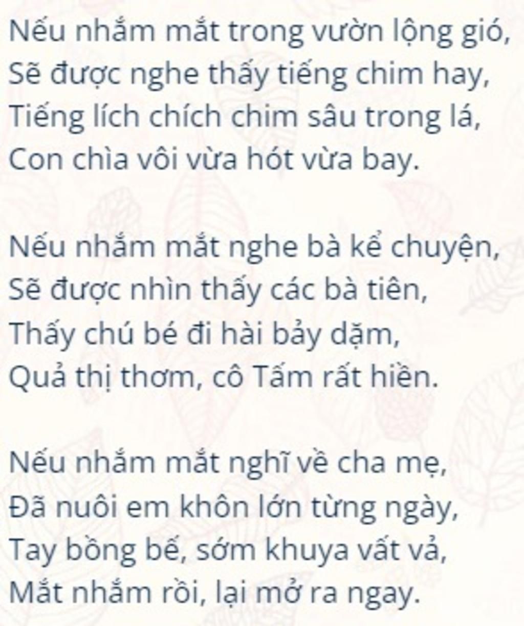 - Mạch cảm xúc của bài thơ: là lời kể đầy tâm tình của nhà thơ dành cho "em". Nếu nhắm mắt trong vườn lộng gió sẽ cảm nhận được tiếng chim, cảm nhận được sự thanh bình của thiên. Nếu nhắm mắt nghe bà kể chuyện sẽ nhìn thấy cả thế giới cổ tích. Và nếu nắm mắt nghĩ về cha mẹ sẽ thấy được cả bầu trời tình thương
