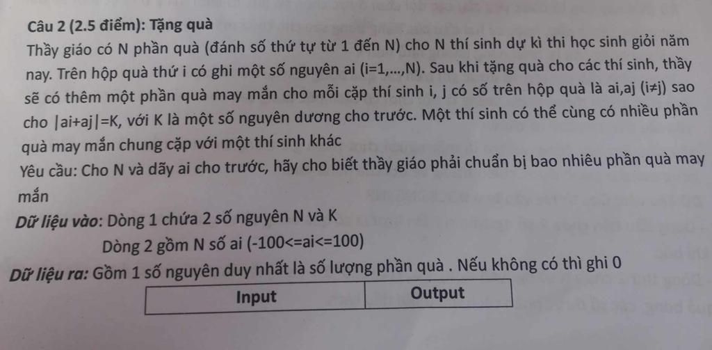 nay. Trên hộp quà thứ i có ghi một số nguyên ai (i=1,...,N). Sau khi tặng quà cho các thí sinh, thầy