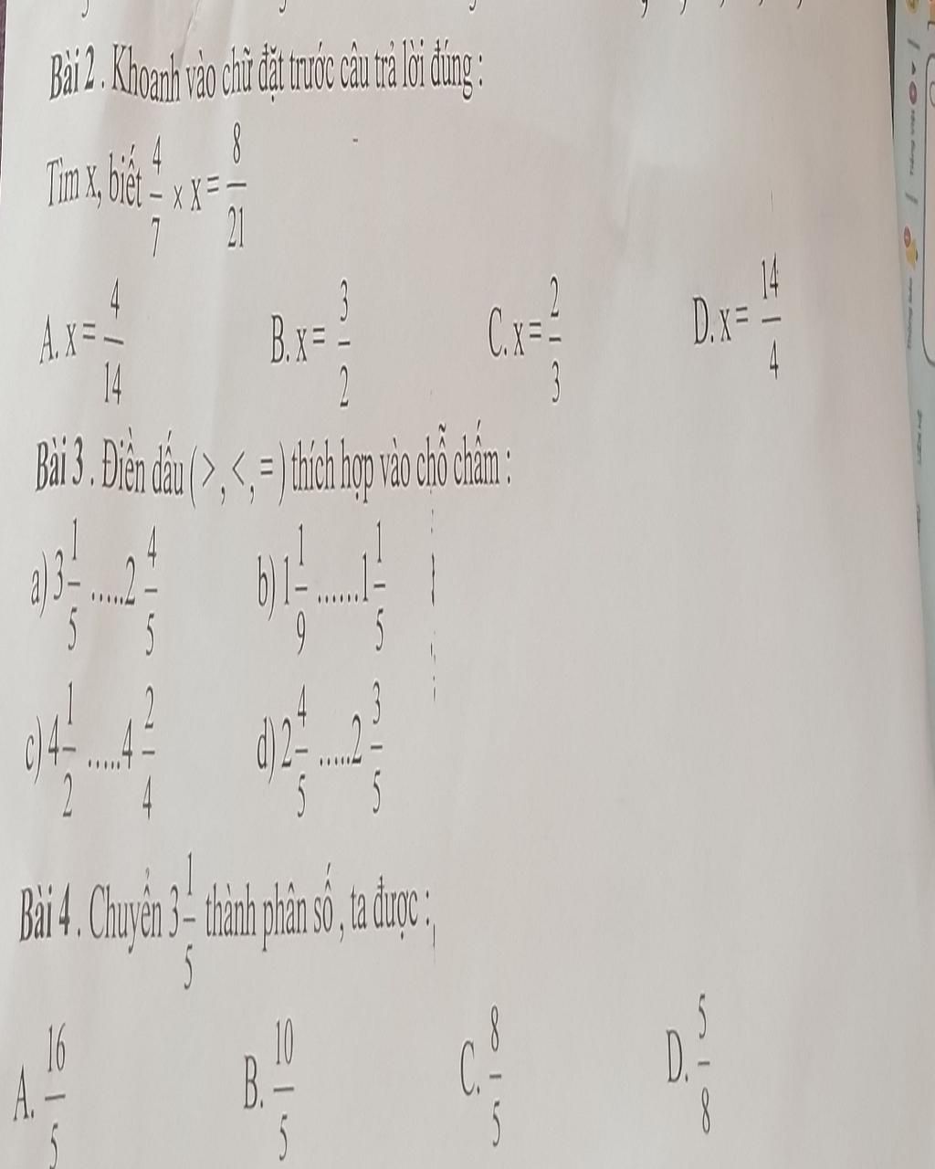 d, Ta thấy hai phần nguyên bằng nhau ta so sánh đến phần phân số. Vì 4>3 nên ta điền dấu ">"