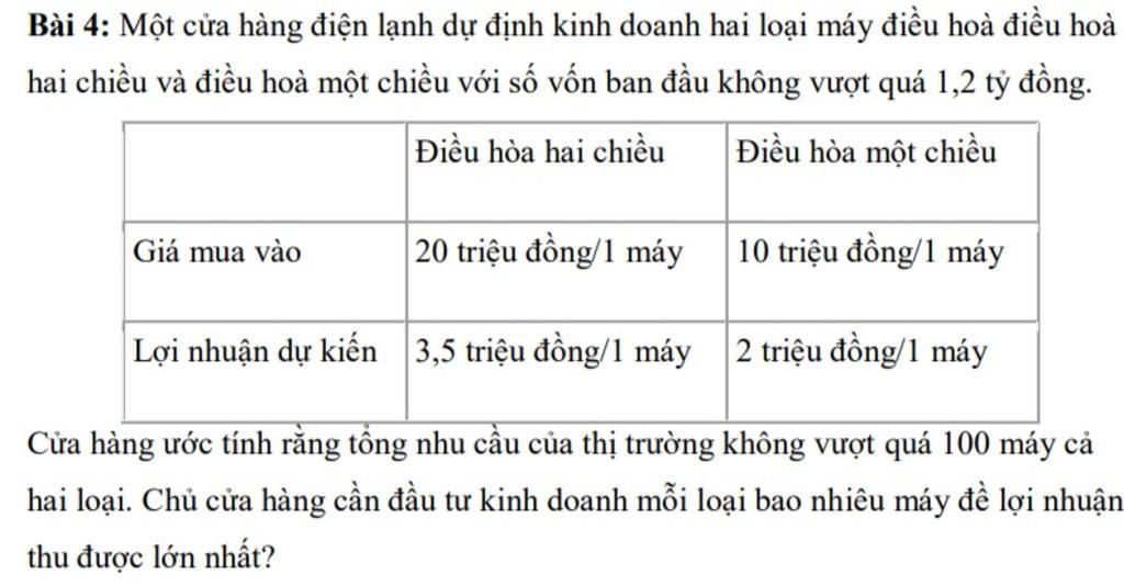 Bài 4: Một cửa hàng điện lạnh dự định kinh doanh hai loại máy điều hoà điều hoà