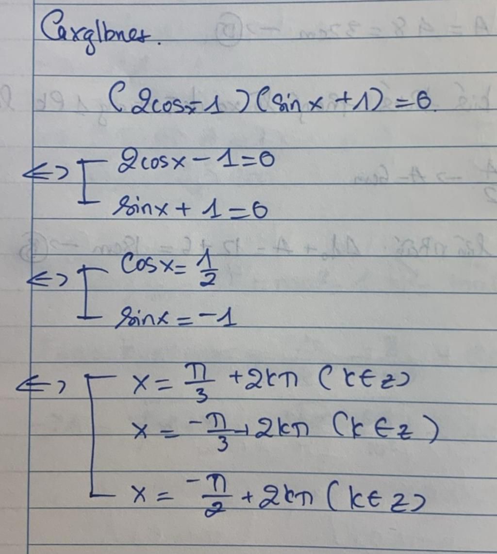 $\Leftrightarrow$ \(\left[ \begin{array}{l}2\cos x-1=0\\\sin x+1=0\end{array} \right.\)