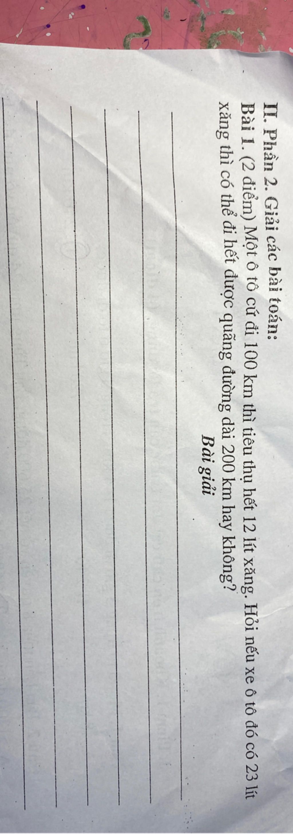 Đáp án: Nếu xe có 23 lít xăng thì không thể đi hết được quãng đường dài 200 km.