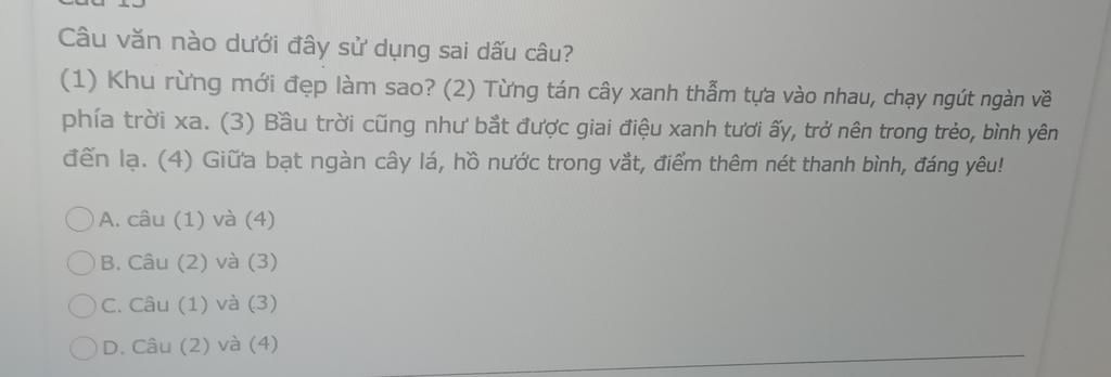 Đáp án: A (Câu 1 và 4 sử dụng sai dấu câu).