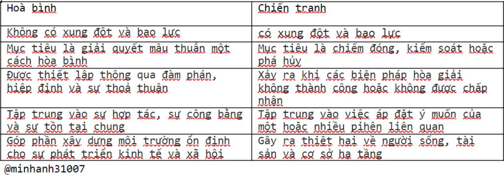 Lập bảng so sánh về hoà bình và chiến tranh là: