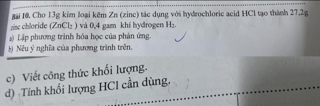 `c)` `m_(Zn` `+` `m_(HCl` `=` `m_(ZnCl_2` `+` `m_(H_2`