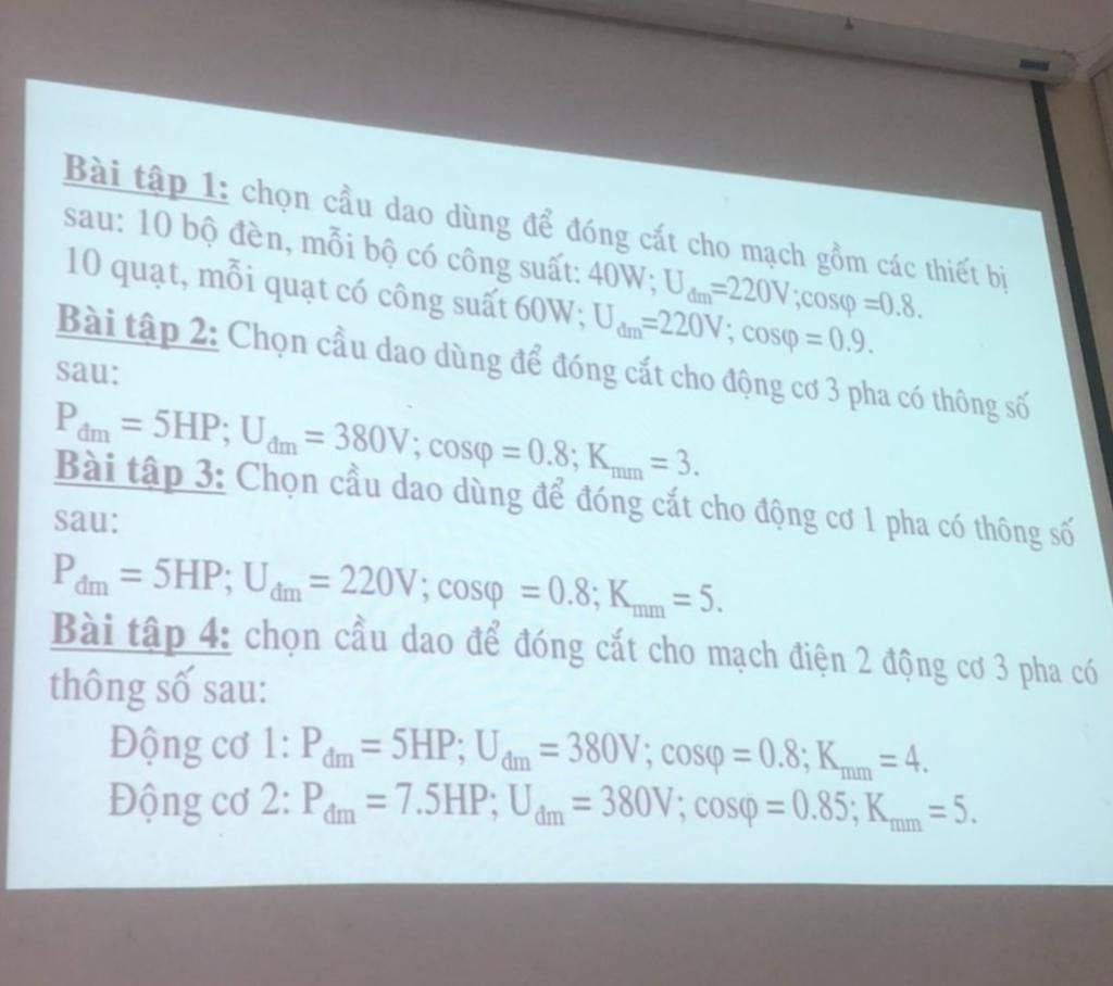 Bài tập 1: chọn cầu dao dùng để đóng cắt cho mạch gồm các thiết bị
