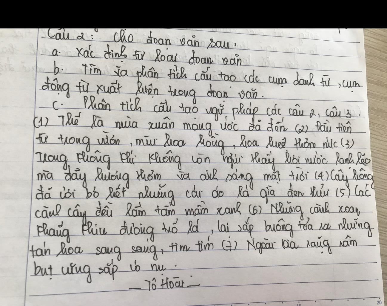 `-` Cụm danh từ : mùa xuân mong ước, hơi nước lạnh lẽo, những cái áo lá già, các cành cây, những cành xoan, những tán hoa, rặng râm bụt.