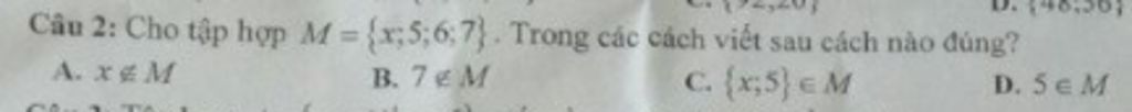 Phần `C` sai vì trong tập `M={x;5;6;7}` còn phần `C` thì tập `M` chỉ có `2` phần tử là `x;5`