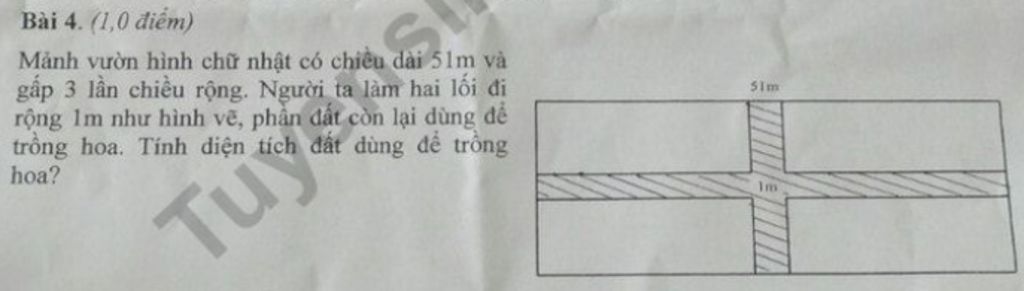 Bài 4. (1,0 điểm) Mảnh vườn hình chữ nhật có chiều dài 51m và gấp 3 lần chiều rộng. Người ta làm hai lối đi rộng 1m như hình vẽ, phần đất còn lại dùng để trồng hoa. Tính diện tích đất dùng để trồng hoa?