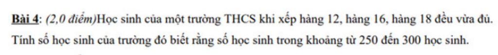 Nếu xếp hàng `12`; hàng `16`; hàng `18` đều vừa đủ tức số học sinh trường đó là `BC ( 12; 16; 18 )`