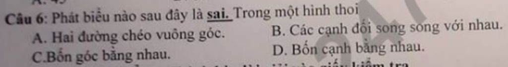 `->` Loại `D.` Bốn cạnh bằng nhau