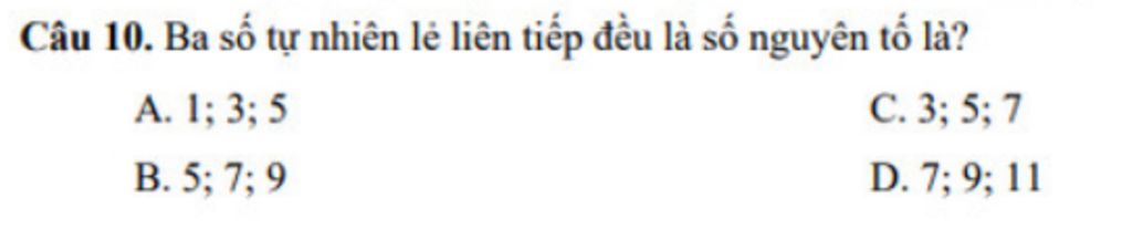 `C.` Vì `3;5;7` chỉ có `2` ước duy nhất và đây cũng là ba số nguyên tố lẻ liên tiếp