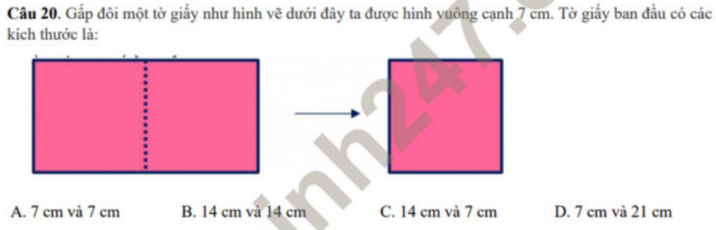 Câu 20. Gấp đôi một tờ giấy như hình vẽ dưới đây ta được hình vuông cạnh 7 cm. Tờ giấy ban đầu có các