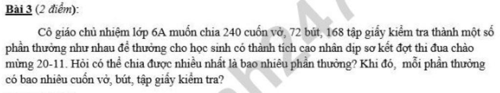 Vậy có thể chia được nhiều nhất `24` phần quà và mỗi phần có `10` cuốn vở `; 3` cây bút `; 7` tập giấy kiểm tra.
