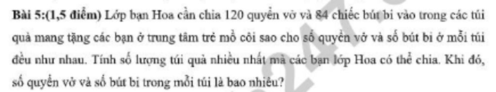 Vậy số quyển vở và số bút bi trong mỗi túi là 12